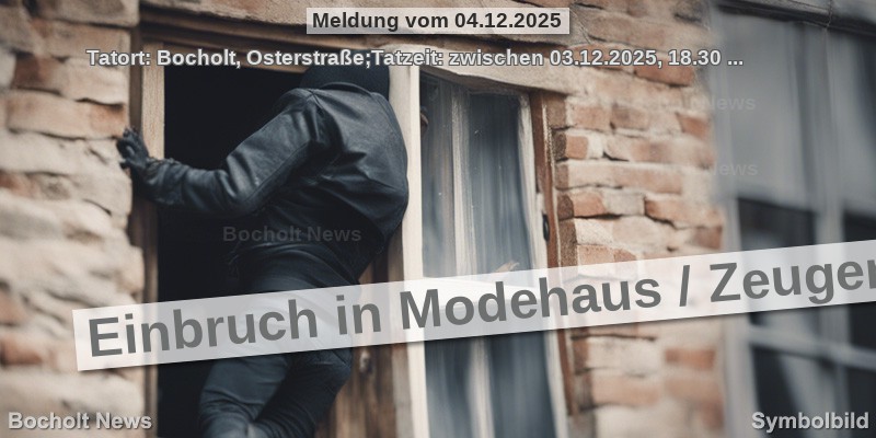 Tatort: Bocholt, Osterstraße;Tatzeit: zwischen 03.12.2025, 18.30 Uhr und 04.12.2025, 05.50 Uhr;Unbekannte Täter haben in der Nacht zum Donnerstag ein Schaufenster eines Modehauses an der Osterstraße in Bocholt beschädigt und Waren entwendet. Gegen 05:50 Uhr bemerkte eine Zeugin auf dem Weg zur Arbei... Mehr...