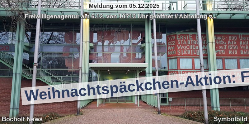 Freiwilligenagentur am 6.12. von 10?13 Uhr geöffnet // Abholung von Kartons möglich // Abgabe fertiger Päckchen // Weitere Infos online Am Samstag, 6. Dezember 2025, bietet die Freiwilligenagentur eine zusätzliche Öffnungszeit von 10 bis 13 Uhr an. Bürger... Mehr...