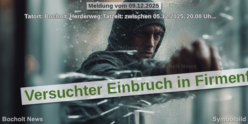 Tatort: Bocholt, Herderweg;Tatzeit: zwischen 05.12.2025, 20.00 Uhr und 06.12.2025, 08.00 Uhr;In der Zeit zwischen Freitagabend und Samstagmorgen, kam es am Herderweg zu einem versuchten Einbruch in ein Firmenfahrzeug.Der Geschädigte stellte am Morgen zwei Bohrlöcher an der rechten Schiebetür seines ... Mehr...