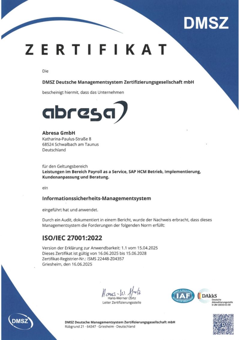 Schwalbach am Taunus, 24. Juni 2025 - Die abresa GmbH (https://abresa.de/) hat die Zertifizierung nach der international anerkannten Norm ISO/IEC 27001 erfolgreich abgeschlossen. Damit bestätigt der SAP- und HR-Dienstleister, dass Informationssicherheit im Unternehmen systematisch verankert ist und dass interne wie externe Anforderungen an den Schutz sensibler Daten konsequent umgesetzt werden.