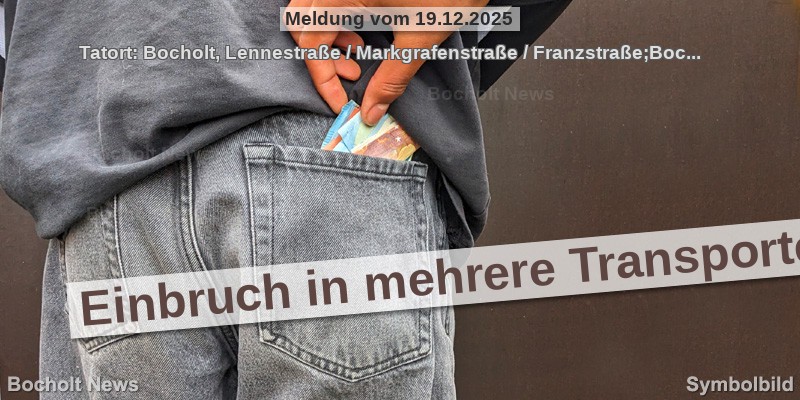 Tatort: Bocholt, Lennestraße / Markgrafenstraße / Franzstraße;Bocholt-Biemenhorst, Bernhard-Otto-Straße;Tatzeit: zwischen 17.12.2025 19.30 Uhr und 19.12.2025, 09.00 Uhr;Bislang unbekannte Täter brachen in Bocholt in drei Fahrzeuge ein. Die Einbrecher öffneten diese im Bereich der Lennestraße, Markgr... Mehr...